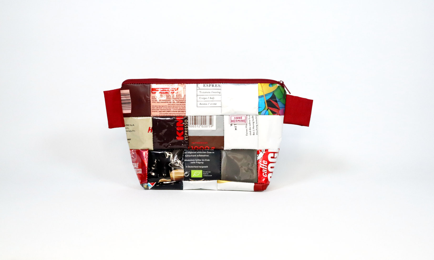 Carry all your beauty essentials in style while making a positive impact on the planet with our Large upcycled Cosmetic Bag, expertly handcrafted from recycled coffee packaging.