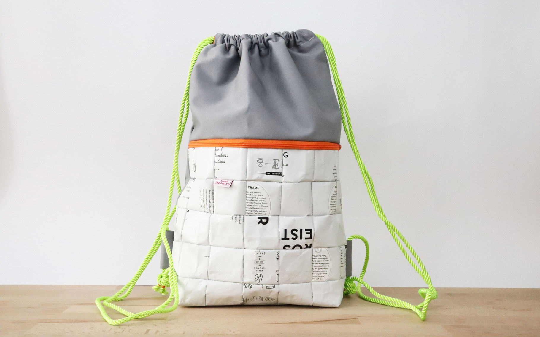 The white coffee packaging is combined with a beautiful, grey fabric. The inside is lined with an orange fabric and you find a small pocket with a zipper where you can put your keys and a wallet. In addition there is a zipper compartment on the outside.